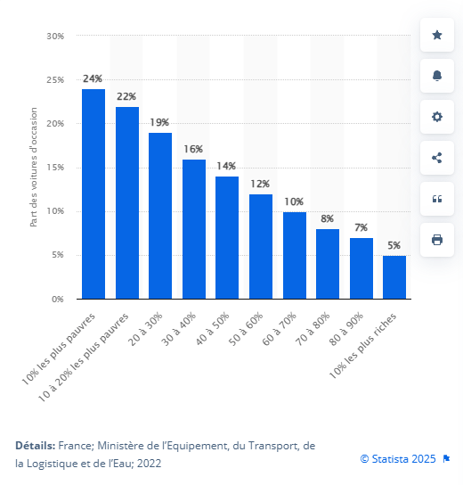 Nous nous sommes penché sur le marché de l’occasion automobile et avons pu constater grâce à Statista que en 2022, les véhicules d’occasion âgés de 15 à 20 ans représentaient 24 % des achats de voitures pour les 10 % les plus pauvres. (Statista)